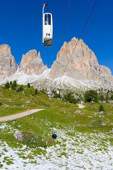 The "Telecabina Forcella del Sassolungo", originally constructed in 1972, is often referred to as a ‘coffin lift’ due to the shape of its tall but narrow cabins. The Telecabina climbs a vertical ascent of 493 meter over a horizontal distance of 1522 meters.