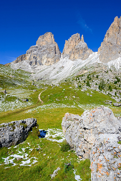 Steep mountains of the Sella Group rise up against a blue sky from the green meadows alongside the Sella Pass