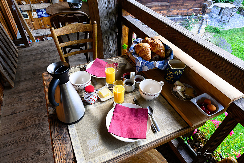 Breakfast at Chambres d'hôtes du Mont with view at mountain Pointe de Sales (2495 m)